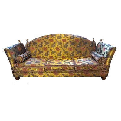 Divano a tre posti, rivestito in tessuto cangiante oro con motivi floreali