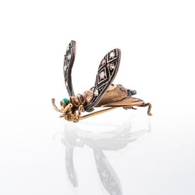 SPILLA IN ORO 9 KT A FORMA DI APE CON DIAMANTE E PIETRE VARIE