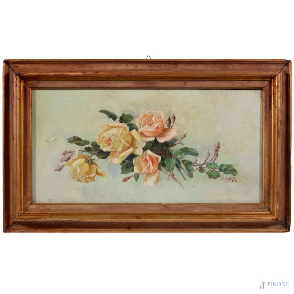 Rose, Olio Su Tela ,CM 30 X 61, Firmato E Datato "1930" In Basso A Destra, Entro Cornice