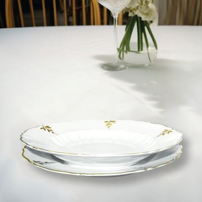 Servizio di piatti da 12 bianco con perfilo dorato e decoro a foglie dorato