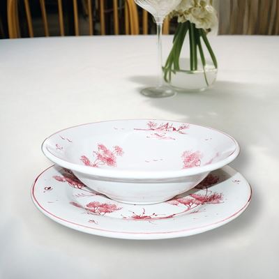 Servizio di piatti da 12 in ceramica bianca con personaggi sui toni del rosa.