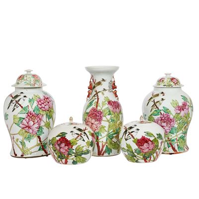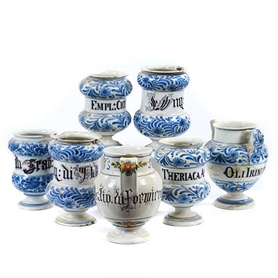 Coppia di albarelli, tre albarelli e due versatoi, secc. XIX-XX