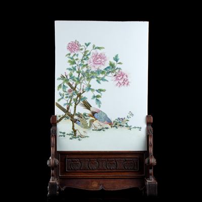 PARAVENTO DA TAVOLO CON PLACCA IN PORCELLANA CON DECORO A SMALTI POLICROMI E SOSTEGNO IN LEGNO