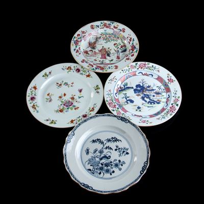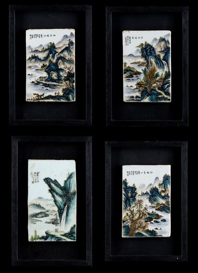 QUATTRO PIASTRELLE IN PORCELLANA CON DECORO A SMALTI POLICROMI
