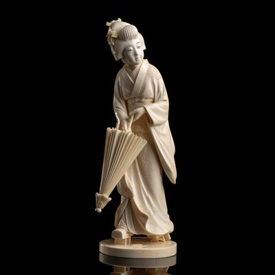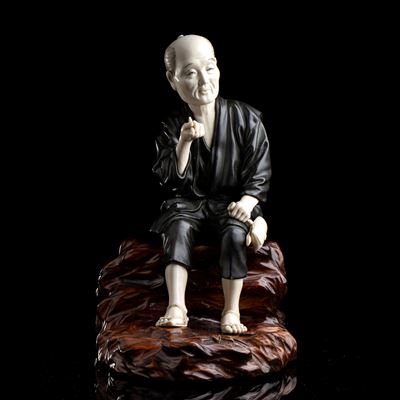 GRANDE OKIMONO IN METALLO E AVORIO CON SUA BASE IN LEGNO