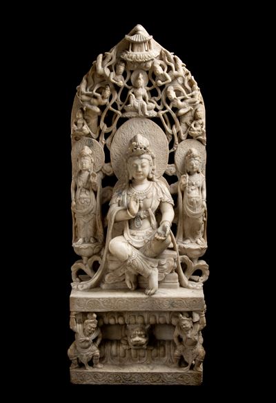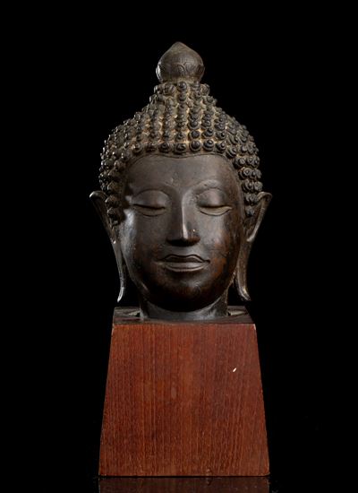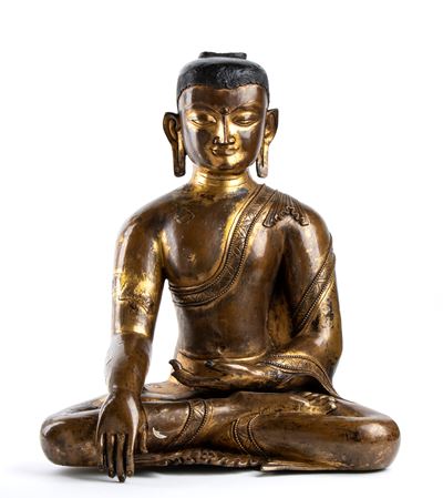 RARA E GRANDE FIGURA DI SHAKYAMUNI IN LEGA DI RAME CON TRACCE DI DORATURA