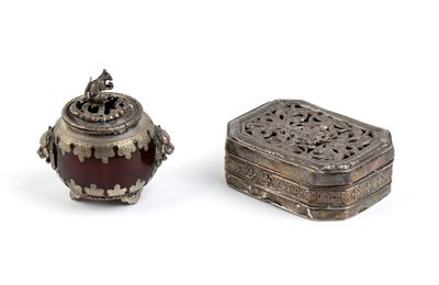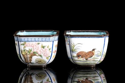 DUE CIOTOLE IN METALLO CON DECORO A SMALTI POLICROMI
