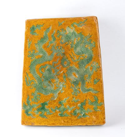 MATTONELLA IN CERAMICA CON DECORO A SMALTI VERDE E GIALLO