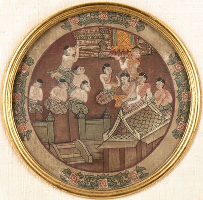 DIPINTO A COLORI SU TESSUTO CON BUDDHA E DEVOTI
