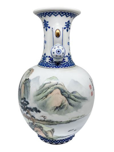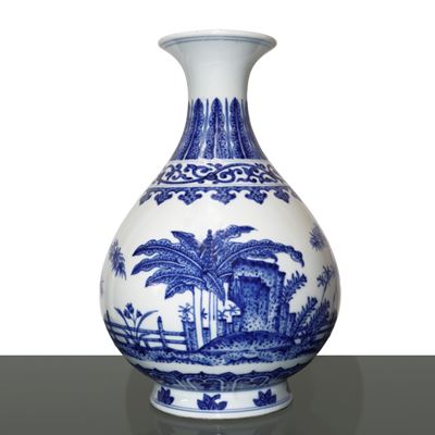 Vaso nei toni del bianco e del blu con scene di genere e paesaggio con cascata