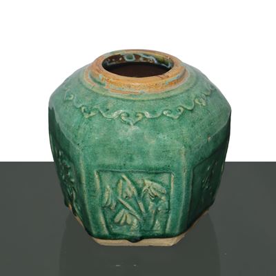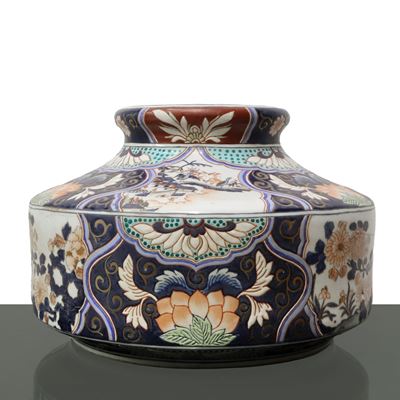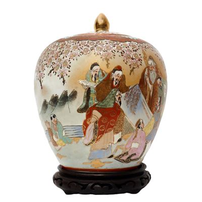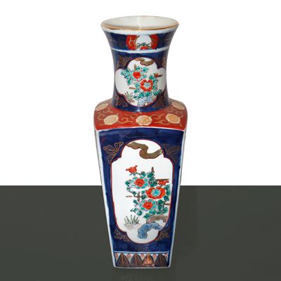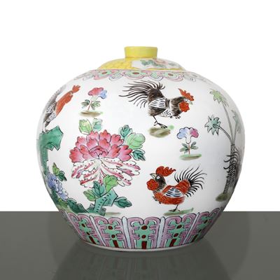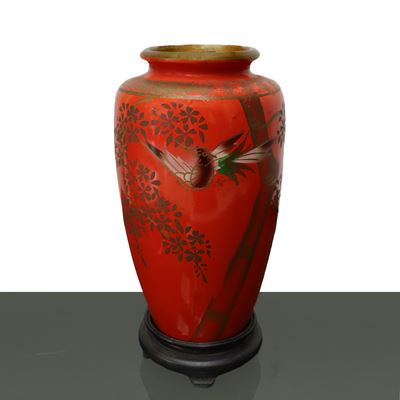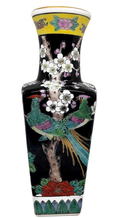 Vaso antico giapponese di porcellana smaltata gialla con raffigurazioni floreali e uccello