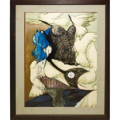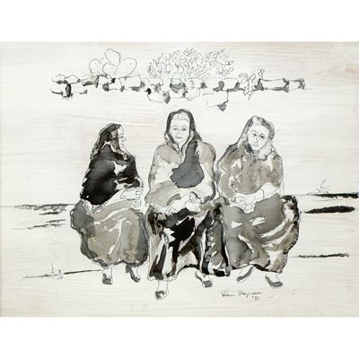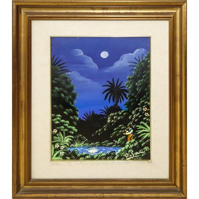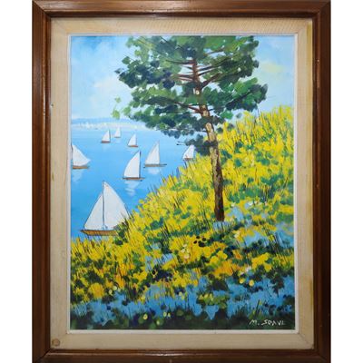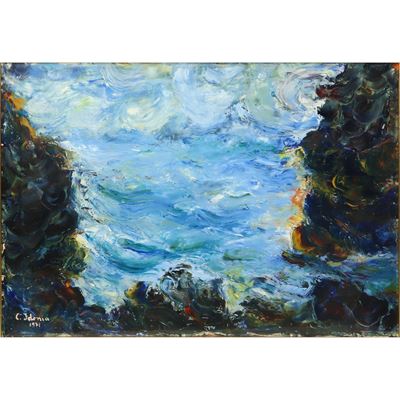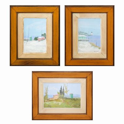 Trittico di dipinti, Faro, Paesaggio innevato sul mare, paesaggio con alberi sul mare