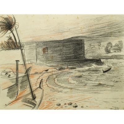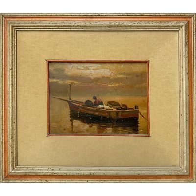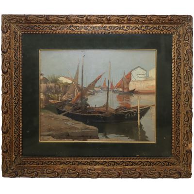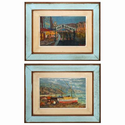 Coppia di paesaggi, Notturno di Venezia e Ponte di Rialto, Marina con barche a secco
