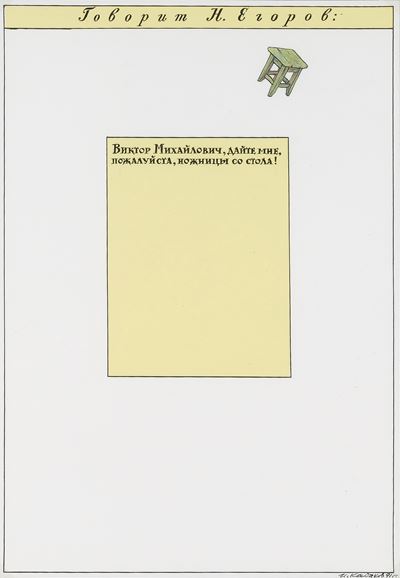Zegt M. Egorov: “Viktor Mikhaïlowitsch, geef me eens de schaar van op de tafel a.u.b.” (Commentar...