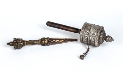 Ruota da preghiera tibetana in argento e phurbu in bronzo
