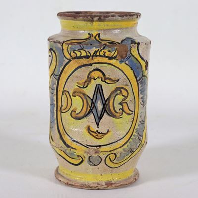 Antico Albarello da Farmacia in Maiolica Toscana con Medaglione Policromo, Mancanze e Difetti