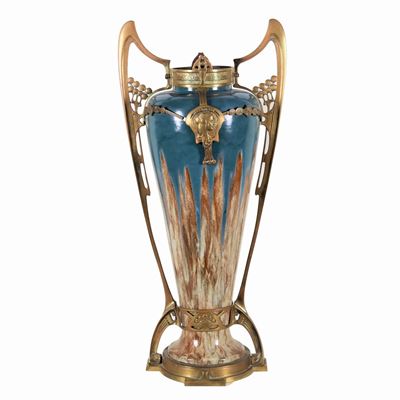 Antico Vaso Art Nouveau in Terracotta Smaltata, con Colature Marroni e Avana su Fondo Blu, Manici...