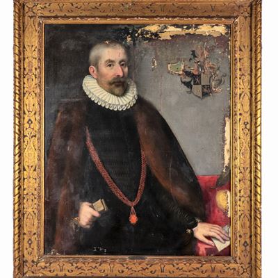 Bottega DI. "ritratto DI Nobiluomo con Collare e Stemma Gentilizio", Dipinto Ad Olio su Tela