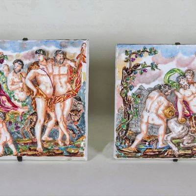 "scene Mitologiche", Coppia DI Mattonelle in Porcellana Policroma Capodimonte, Lavorate a Rilievo
