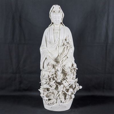"guanyin con Allegoria DI Piccoli Buddha", Grande Scultura Cinese in Porcellana Bianca, Qualche P...