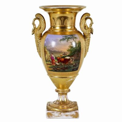 Vaso Ad Anfora Epoca Impero in Porcellana Dorata, con Riquadri Dipinti DI "scene Contadine" e Man...