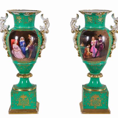 Coppia DI Vasi Francesi Ad Anfora Epoca Luigi Filippo (1830-1848), in Porcellana Verde e Oro Zecc...
