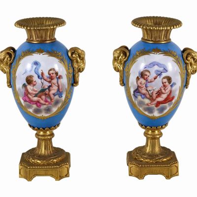 Coppia DI Antichi Piccoli Vasi in Porcellana Francese DI Sèvres e Bronzo Dorato, con Medaglioni V...