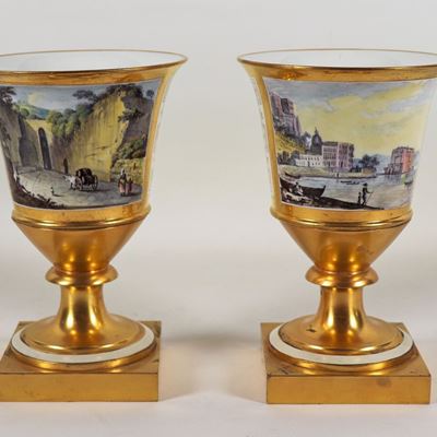 Coppia DI Antichi Vasi Napoletani in Porcellana Bianca e Oro con Riquadri Dipinti "L'entrata dell...
