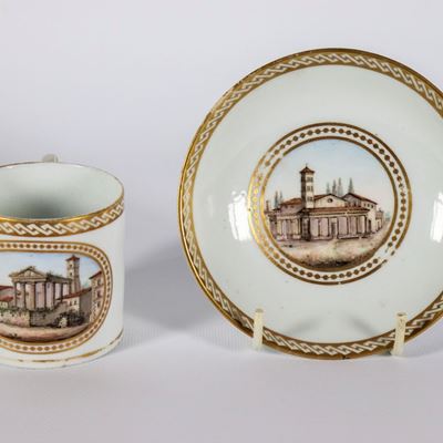 Antica Tazza con Piattino in Porcellana Bianca e Oro Zecchino, con Riquadri Dipinti "il Tempio DI...