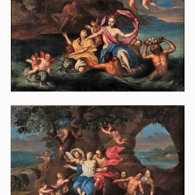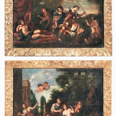 Seguace DI. "venere e Adone" e "la Toletta DI Venere", Coppia DI Dipinti Ad Olio su Tela DI Prege...