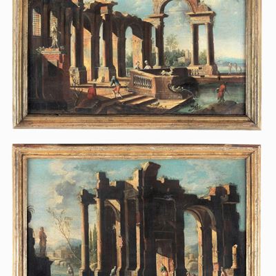 Attribuiti. “ruderi con Architetture e Personaggi”, Coppia DI Dipinti Ad Olio su Tela DI Pregevol...