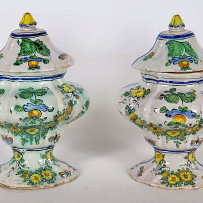 Coppia DI Antichi Vasi con Coperchi in Maiolica Smaltata DI Pesaro, con Decorazioni Variopinte DI...