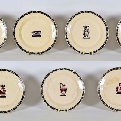 Lotto DI Sette Antichi Piatti in Ceramica Maiolicata Giustiniani, al Centro Decorazioni con Vasi ...
