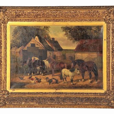 Firmato. "cavalli Fuori la Stalla con Galline che Razzolano", Dipinto Ad Olio su Tela