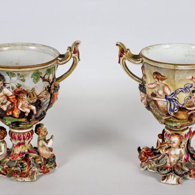 Coppia DI Coppe in Porcellana Policroma Capodimonte, con Figure Mitologiche a Rilievo. Difetti e ...