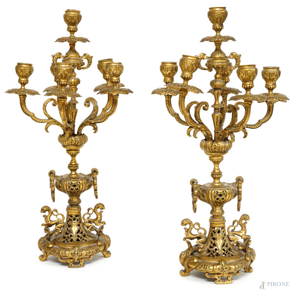 Coppia DI Candelieri In Metallo Dorato A Sei Bracci, Decorato Con Motivi A Volute E Grifoni, XX S...