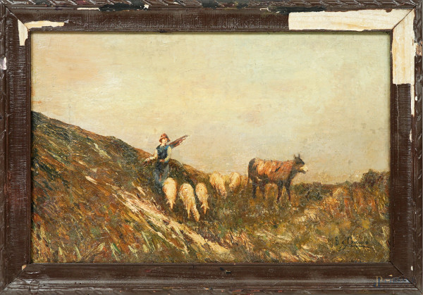 Al Pascolo, Olio Su Tela, Firmato In Basso A Destra, CM 26,2 X 40, Entro Cornice (Difetti)