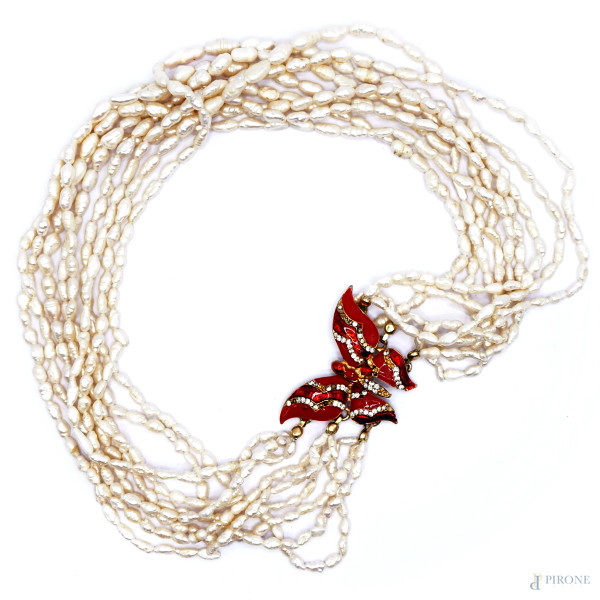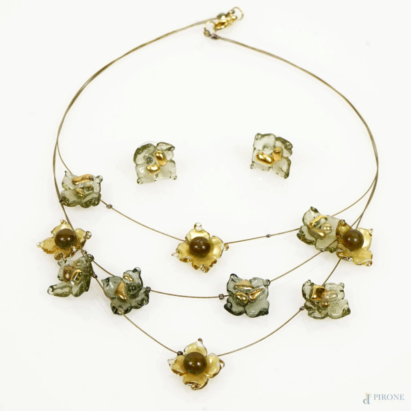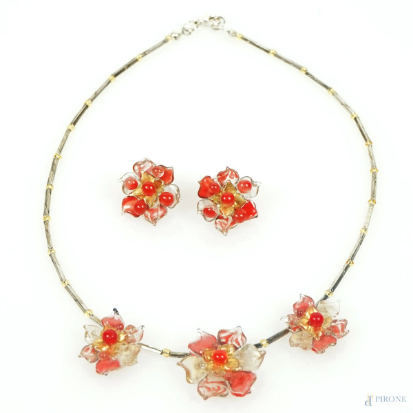 Parure Collana E Orecchini, In Argento E Vetro In Vetro Rosso E Dorato, Lunghezza Della Collana C...