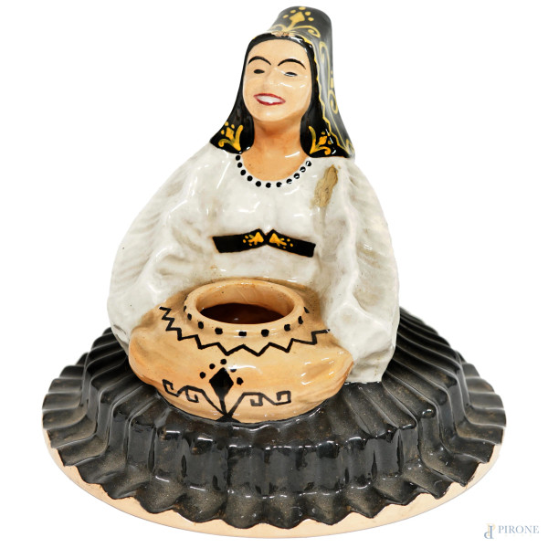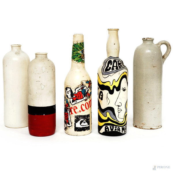 Lotto Composto Da 4 Bottiglie In Vetro Decorate A Tecnica Mista Ed 1 Versatoio In Ceramica Smalta...