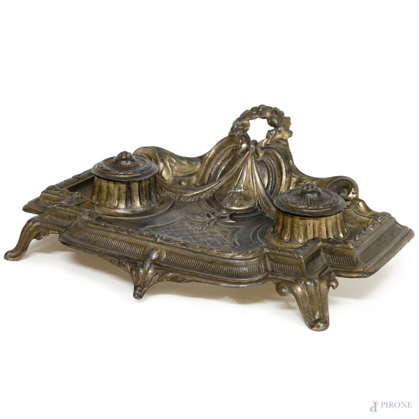 Calamaio Art Nouveau In Metallo Dorato Cesellato, Francia, Fine XIX Secolo, 23 X 18
