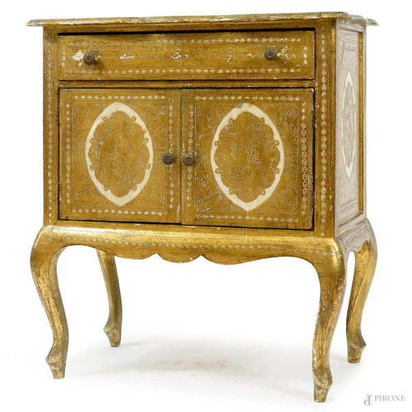 Mobiletto In Legno Dorato Con Decori Incisi, XX Secolo, Fronte Ad Un Cassetto E Due Sportelli, Ga...