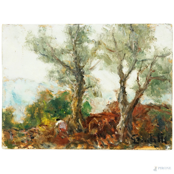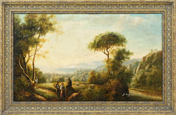Paesaggio Con Figure, Olio Su Tavola, Firmato, CM 44 X 73, Entro Cornice