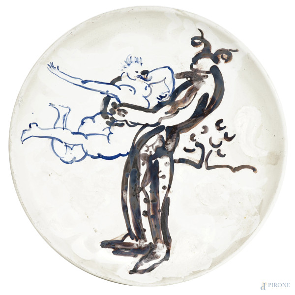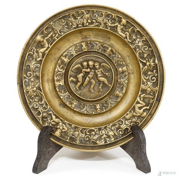 Piatto In Bronzo Decorato A Bassorilievo Con Tre Putti Al Centro, Tesa A Grottesche Con Mascheron...