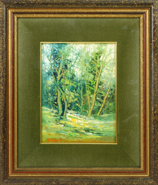 Scorcio DI Bosco, Olio Su Lastra In Metallo Dorato, CM 21,5 X 16, Firmato Veneziani, Entro Cornic...