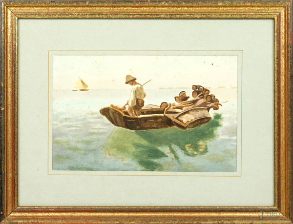 Pescatorello, Acquerello Su Carta, XX Secolo, CM 28 X 37, Entro Cornice