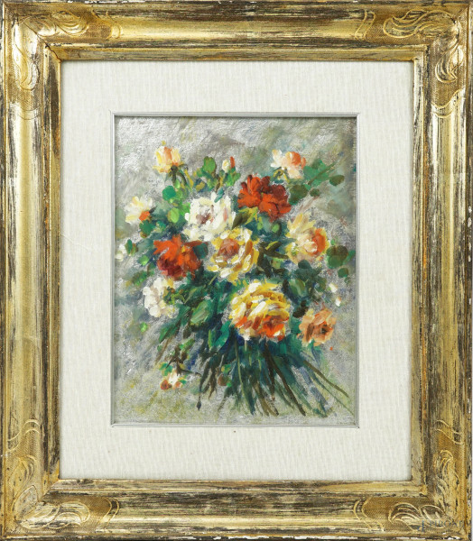 Fiori, Olio Su Tela, CM 24,5 X 30, XX Secolo, Entro Cornice