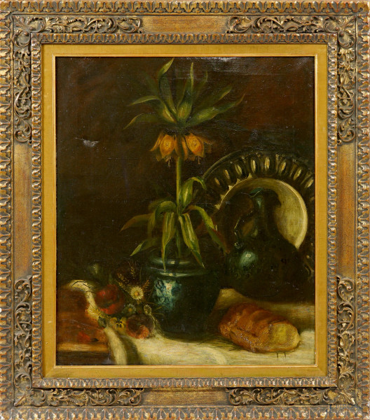 Pittore Del XIX-XX Secolo, Natura Morta Con Fritillaria Imperialis, Fiori, Pane E Brocca, Olio Su...