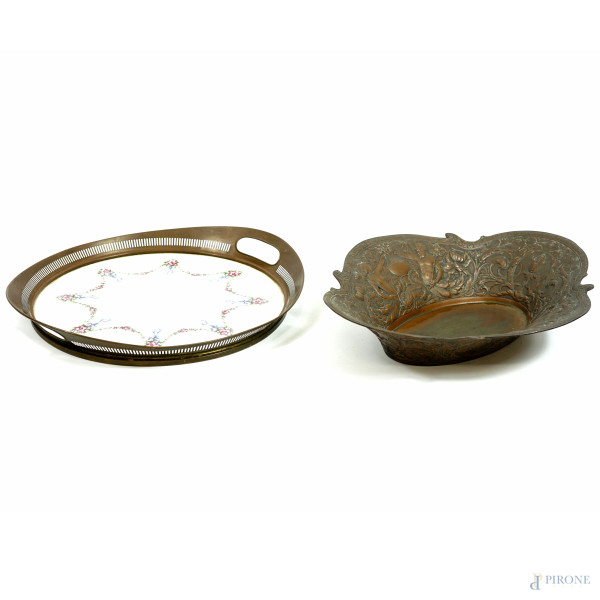 Lotto Composto Da Un Centro Tavola Ovale In Metallo Sbalzato Con Decori Vegetali E Figure E Un Va...