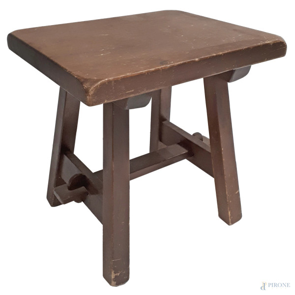 Piccolo Raro Sgabello In Legno Massello, Vecchia Manifattura Italiana, CM 36 X 45, Altezza CM 46