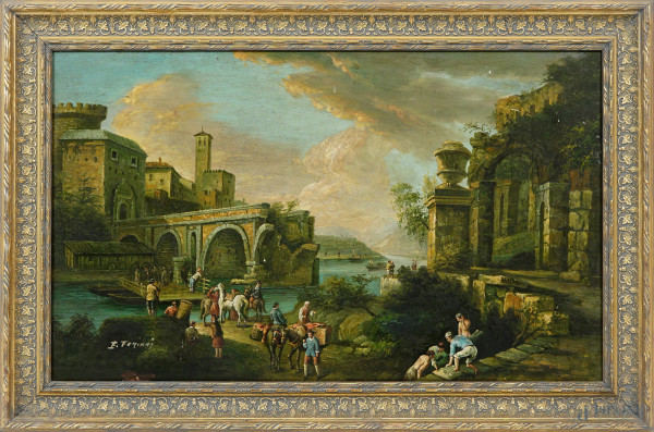 Capriccio Con Figure, Olio Su Tavola, Firmato, CM 44 X 73, Entro Cornice
